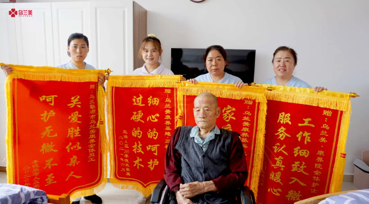 原來(lái),李爺爺家屬口中的護(hù)士和護(hù)理人員們都在烏蘭美康養(yǎng)院工作,她們用過(guò)硬的專業(yè)知識(shí)和嫻熟的照護(hù)技能,對(duì)入院的長(zhǎng)者進(jìn)行專業(yè)護(hù)理,用細(xì)心、耐心、愛(ài)心、責(zé)任心陪伴左右,不怕苦、不怕累,盡職盡責(zé)的為長(zhǎng)者緩解消除恐懼、焦慮和陌生感,減輕身心痛苦。她們待長(zhǎng)者如親人的用心照料,讓李爺爺家屬十分感動(dòng),所以連送四面錦旗,以表誠(chéng)摯的感謝。