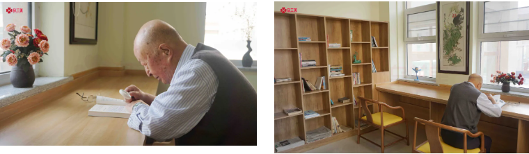 在烏蘭美康養(yǎng)院的圖書室里,人們常常會看到一位老人拿著放大鏡在埋頭讀書,一讀就是2小時。談及爺爺?shù)拈喿x愛好,老人家興奮地說:“我每天早上起來,在康養(yǎng)院內(nèi)散散步。九點左右就去康復(fù)訓(xùn)練室里用按摩椅活動活動筋骨,九點半左右我就去圖書室了,一般看兩小時的書。每天中午和晚上睡覺前,我是一定要看一小時書的,這已經(jīng)成為了生活‘必需品’。”不少人感嘆王爺爺?shù)淖月?,他卻打趣道:“我也是勞逸結(jié)合!午睡后,我會到活動室打兩小時的麻將。”