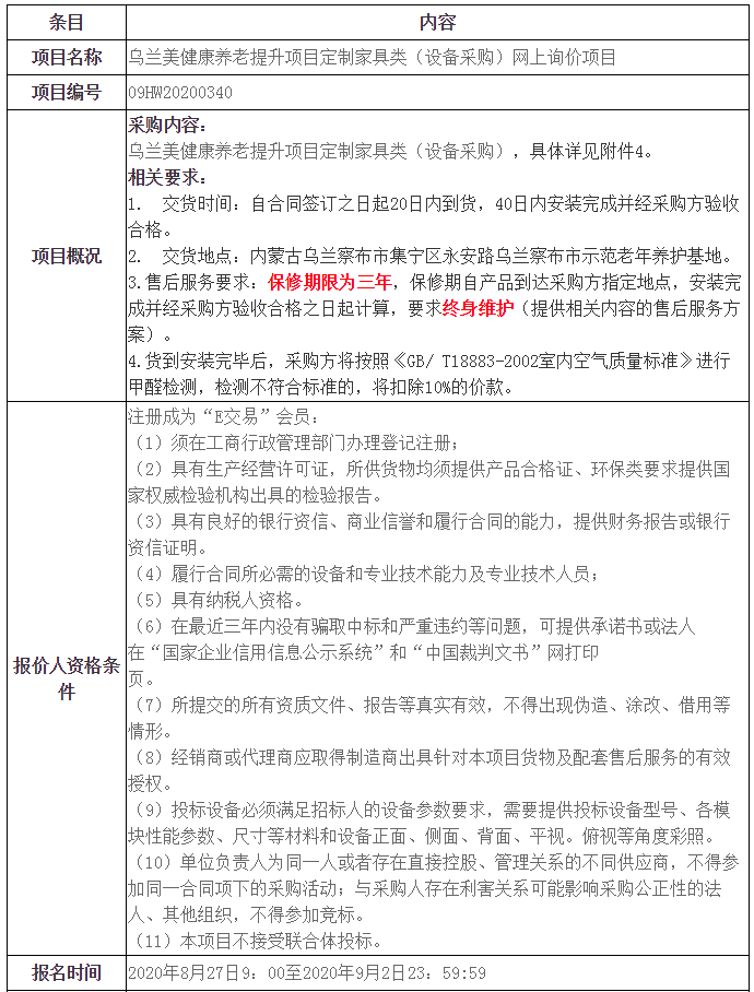 烏蘭美健康養(yǎng)老提升項(xiàng)目定制家具類(設(shè)備采購)網(wǎng)上詢價(jià)項(xiàng)目發(fā)布時(shí)間: 2020-08-27 -