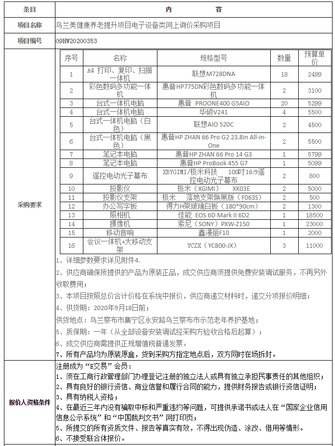 烏蘭美健康養(yǎng)老提升項(xiàng)目電子設(shè)備類網(wǎng)上詢價(jià)采購項(xiàng)目發(fā)布時(shí)間: 2020-09-01 -